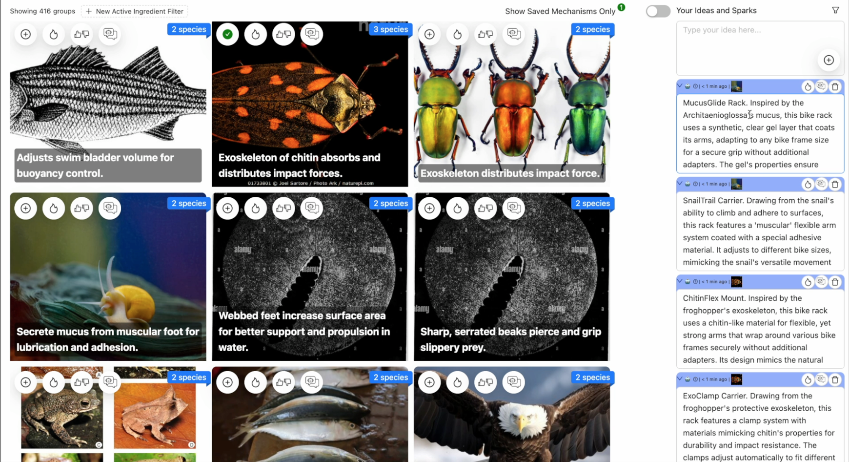 A designer working on a bike rack struggles with "snail mucus" as inspiration. BioSpark translates this into: how the snail's adaptive adhesion could become a hydrogel-based clamp for varied bike frames, including specific hydrogels that remain pliable in winter conditions.
